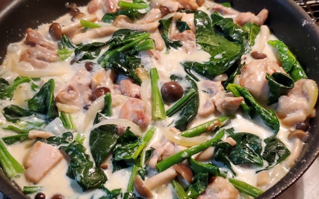 今日は暖かく、除雪しながら汗をかいていました。我が家で採れたほうれん草を使って、ほうれん草と鶏肉のクリーム煮を...