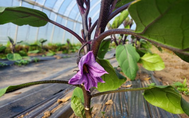 今日は肌寒い朝です。春先に定植したなすの一番花が咲いています。まだまだこれからですが、元気に成長中です。